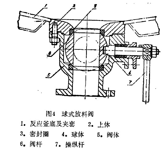 球式殷料閥是在浮動球球閥構(gòu)造的基礎(chǔ)上,結(jié)合反應(yīng)釜使用性能的操作條件進(jìn)行設(shè)計而成的。圖4為球式放料閥的剖面圖,其特點是關(guān)閉件為一帶孔球體4繞通路的垂線作90。旋轉(zhuǎn),以達(dá)到開啟或關(guān)閉的目的,球體兩端各有一個塑性材料制成的球面密封圈3,也稱之閥座。上密封圈裝在反應(yīng)釜底部放料口下側(cè)凹槽內(nèi),這樣可使球體緊貼在反應(yīng)釜的底部,盡量減少球體上的死角容積??紤]到制造上的分工及裝配的方便,將釜底的放料口設(shè)計成一個特殊的凸緣盤,它作為球式放料閥的上段另件,稱為上體1,其上表面按反應(yīng)釜底面的要求加工成凸球面狀,球面曲率與反應(yīng)釜封頭大致一樣,上體中心放料孔與凹球面的交接處加工成大弧形的過渡面使放料口成為一向上的喇叭口,上體的下面則按球閥裝配要求加工,放料口外為裝配密封圈的環(huán)形槽,其外圈是連接閥體5時的定凸臺和閥體密封面,安裝有調(diào)節(jié)墊片。再外面有均勻分布的螺紋孔,以裝入雙頭螺栓與閥體連接。上體2必須先裝配鑲焊于反應(yīng)釜的底部,成為反應(yīng)釜的一部分,打磨內(nèi)表面焊縫,探傷合格后才能裝上閥體、球體.部件。閥體內(nèi)的其他另件基本與通用球閥一致。這種構(gòu)造的放料閥在關(guān)閉狀態(tài)時部分球體凸出在放料口中,,t訇喇叭口之間雖還留有一圈凹槽,有可能成為沉積死料的死角,但由予并不太深,槽的上口很寬大,料液容易受攪拌漿作用而翻起混合,也就可以避免料液的不完全反應(yīng)現(xiàn)象。