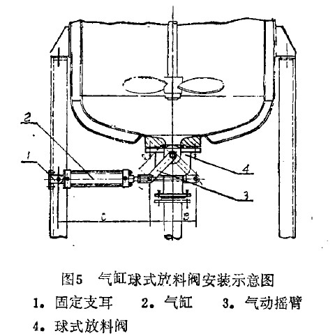 圖5為氣動球式放料閥在反應(yīng)釜上的安裝實例示意圖,圖中表明了氣缸2呈水平狀安裝于球式放料閥的一側(cè),活塞桿與殊式放料閥的氣動搖臂3的一端采用絞接方式。氣缸2的固定端則以支耳絞接形式懸掛在固定支耳1上,固定支耳1則可固定安裝在反應(yīng)釜的支腿上或其他穩(wěn)定性好的任何混凝土構(gòu)件上。